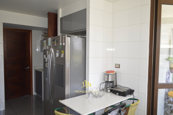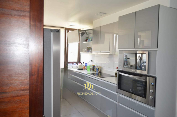 Moderna cocina amoblada, con comedor de diario y equipada con cocina vitrocerámica, microondas, lavavajillas y campana, despensa, logia independiente, closet para ropa blanca.