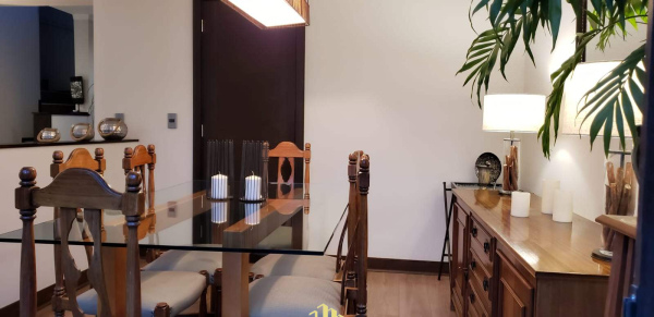 Comedor con entrada directa a una espaciosa cocina, amoblada con encimera horno y campana, espacio para un cómodo comedor de diario.