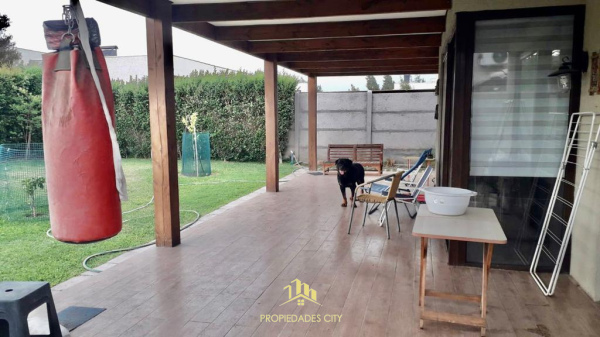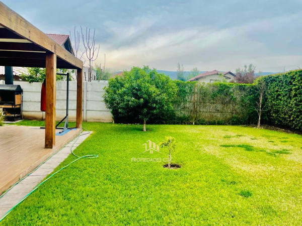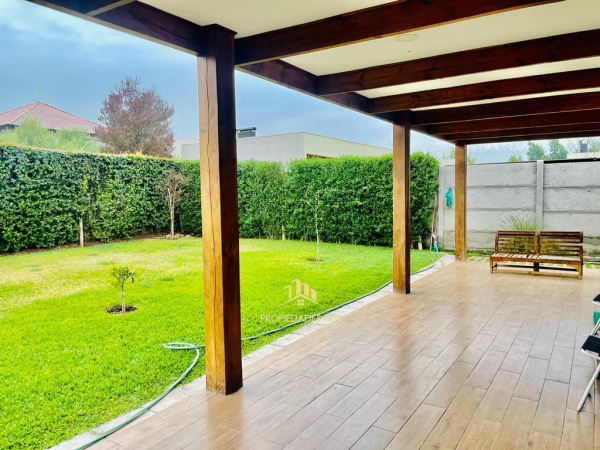 Lindo jardín trasero formado con amplia terraza techada.